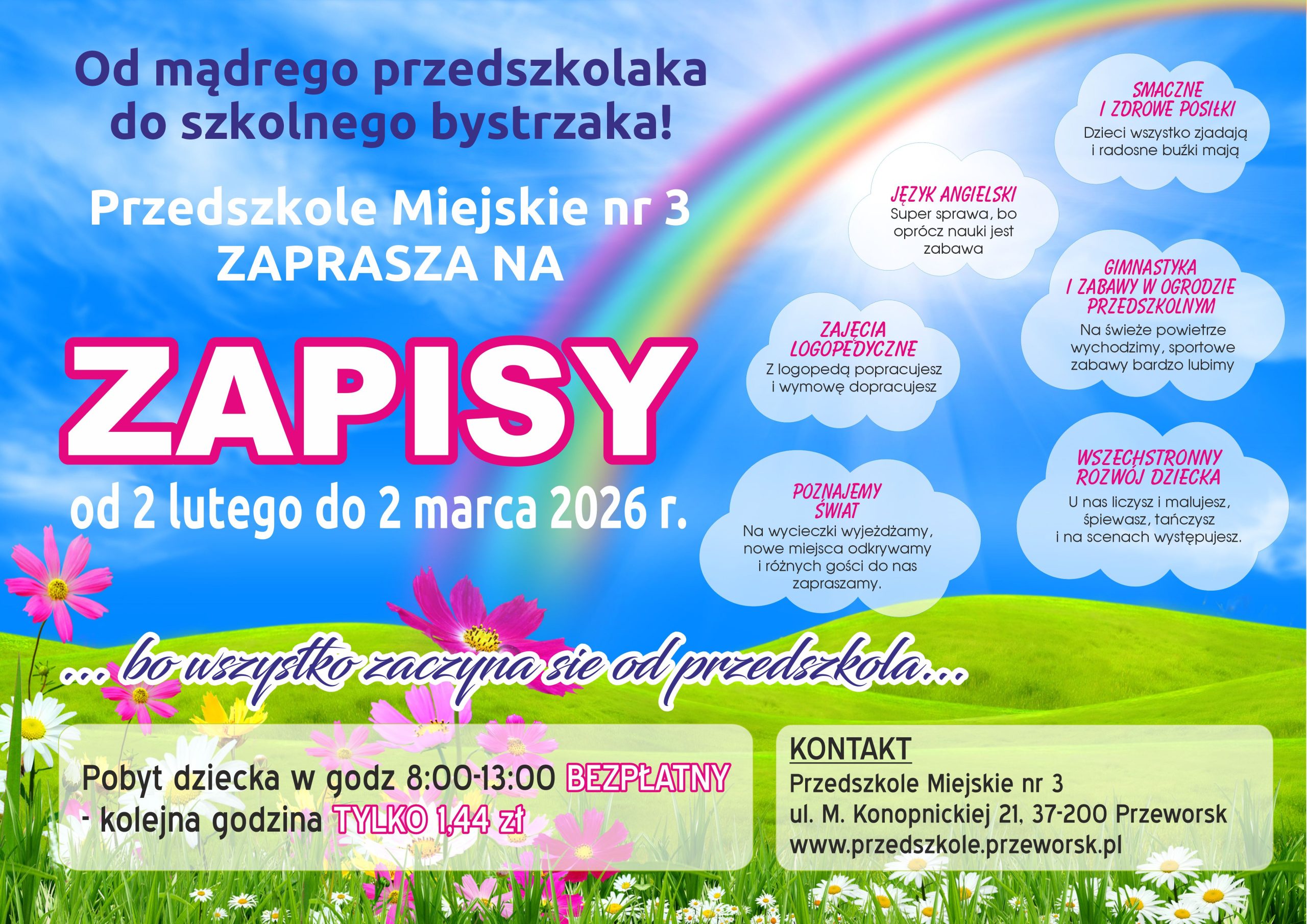 Dyrektor Przedszkola Miejskiego Nr 3 w Przeworsku informuje, że zapisy nowych dzieci w wieku od 2,5 do 5 lat do przedszkola na rok szkolny 2026/2027 rozpoczną się od dnia 02.02.2026 r. do dnia 02.03.2026 r.