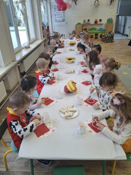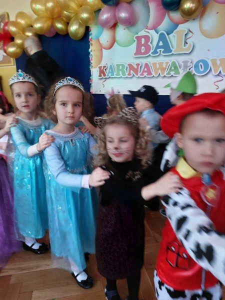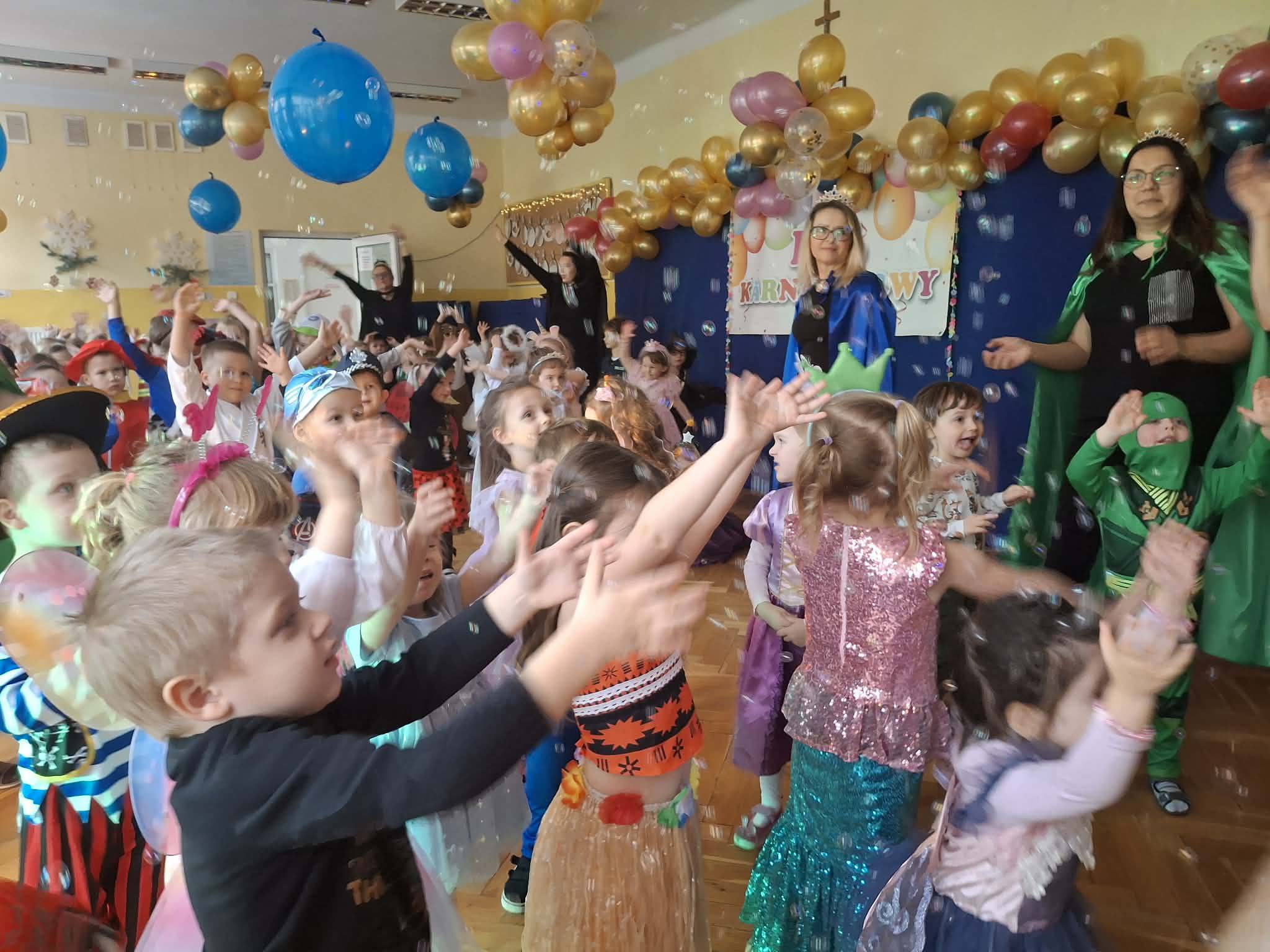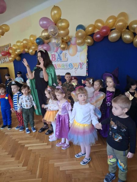 Dzisiaj w naszym przedszkolu odbył się długo wyczekiwany bal karnawałowy, który dostarczył dzieciom mnóstwo radości i niezapomnianych wrażeń. Już od rana sale wypełniły się barwnymi dekoracjami, a wesoła muzyka wprowadziła wszystkich w prawdziwie karnawałowy nastrój.